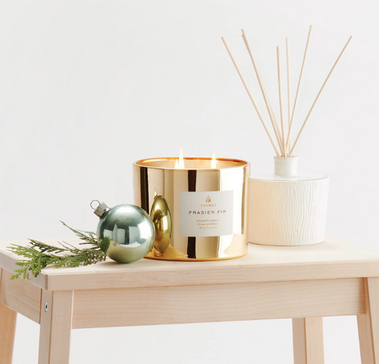 Thymes Frasier Fir Gilded Frosted Wood Grain Candle