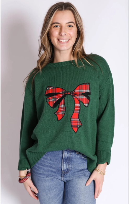 Top It Off Pippa Sweater Green with Tartan Plaid Bow