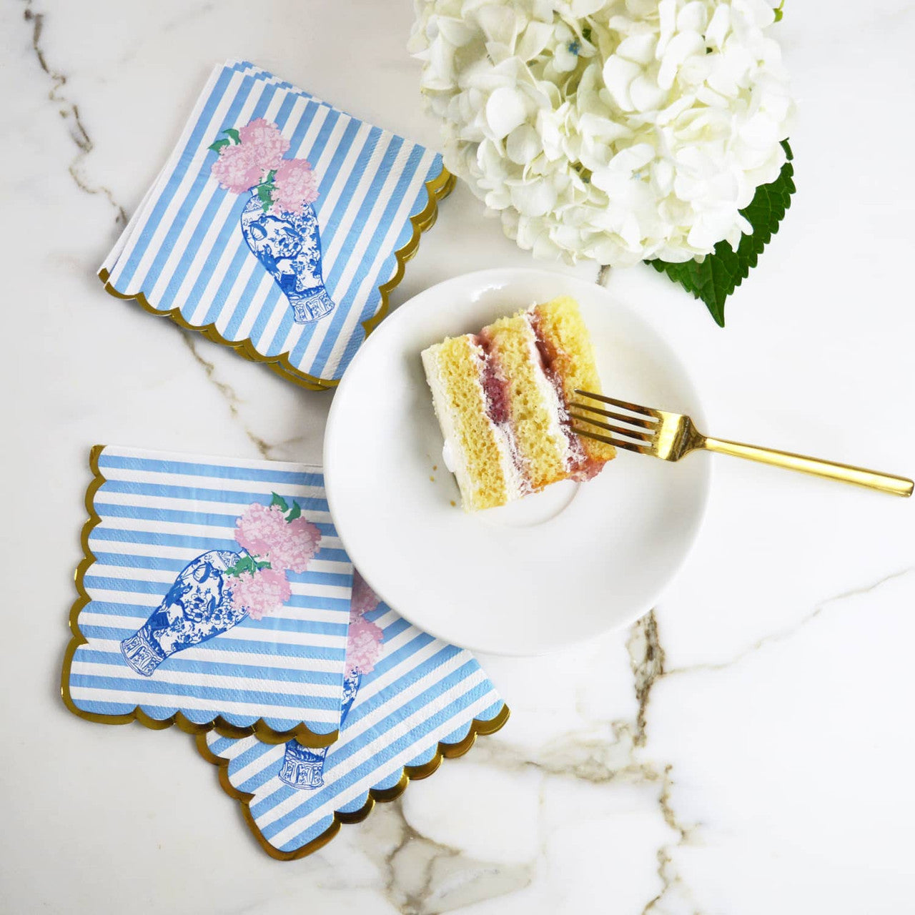 Turn any gathering into a luxurious event with our Ginger Jar Floral Paper Beverage Napkin Pack. These disposable, single-use napkins are the perfect addition to any decor, ensuring your guests can feel like royalty - no matter where the party is! With its exquisite 5.5" x 5.5" design featuring gold scalloped edges and our signature Ginger Jar Rose print, each pack contains 16 napkins and can instantly add a pop of sophistication to any bathroom, bar cart or table. Imported from overseas and designed in the USA, pair these beautiful napkins with our matching napkin holders (available in gold or natural rattan) to complete your elegant ensemble.