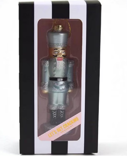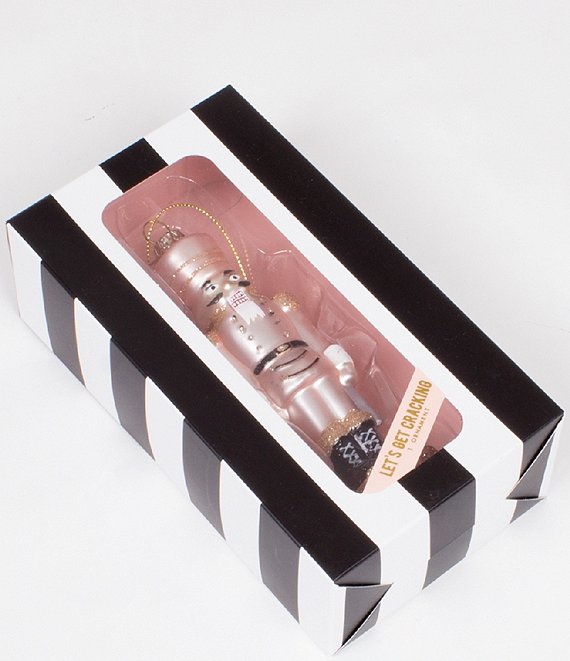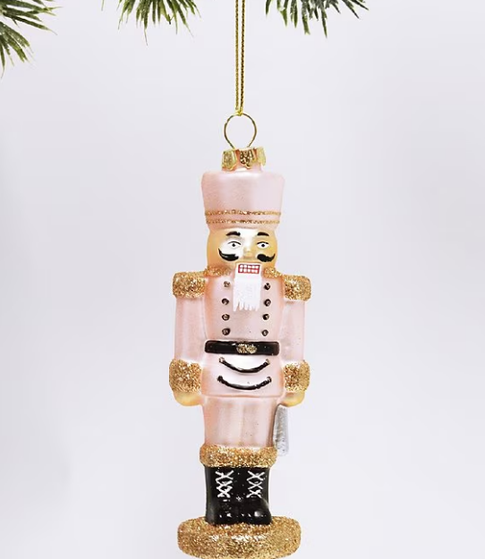 Add a touch of classic beauty to your holiday decorations this year with the Nutcracker Glass Ornament. This gorgeously hand-painted ornament brings a sense of luxury and timeless style to any space, making it an exquisite addition to your tree or mantelpiece. Its size makes it perfect for small spaces while still adding a spark of festivity, featuring a delicate touch of light pink and gold glitter that is sure to delight all who see it. The Nutcracker Glass Ornament is expertly crafted with high-quality imported glass and designed in the USA, so you can trust it will be an elegant staple of your Christmas decor for years to come. It's also boxed for easy gifting, ready to hang with its pre-attached metallic string, making it the perfect surprise for friends and family as well!