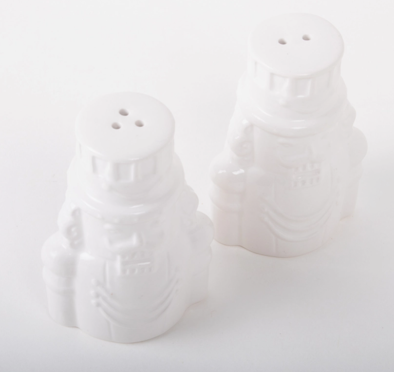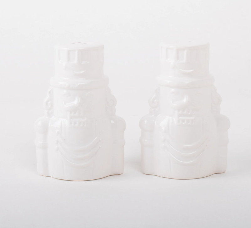 Add elegance, texture & a timeless appeal to your next holiday party with the Nutcracker Salt & Pepper Shaker Sets. These handcrafted ceramic nutcracker salt & pepper shakers in white are a surefire way to add elegance to your tablescape. The perfect tabletop addition to your entertaining space this holiday season. Not only are they boxed for easy gifting, but they match back to a countless number of nutcracker & festive themed pieces for easy mix-and-matching! Make every tablescape memorable with our Nutcracker Salt & Pepper Shaker Sets – add it to your kitchen or dining table today!