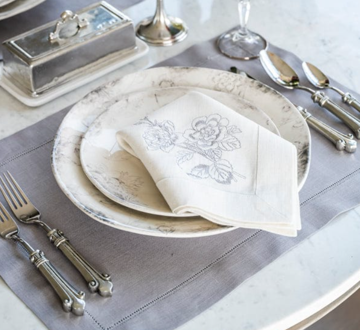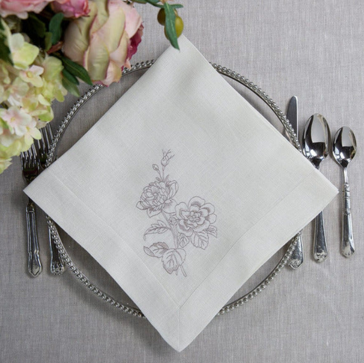 Our Giulietta Floral napkin exudes sophistication and grace. Our elegant intricate design inspired by our Giulietta collection embroidered on 100% European Linen makes the perfect compliment to any table.