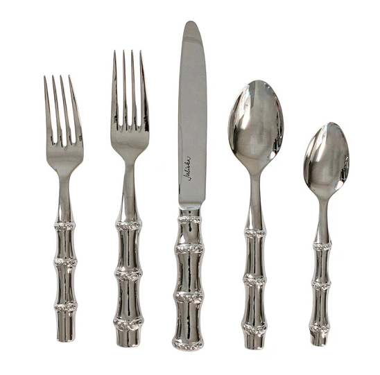 Traditional bamboo flatware is given an elevated twist with beautifully sculpted stainless steel. Polished to brilliance, this elegant set is perfect for any table setting and occasion—while maintaining a subtly eclectic flair.