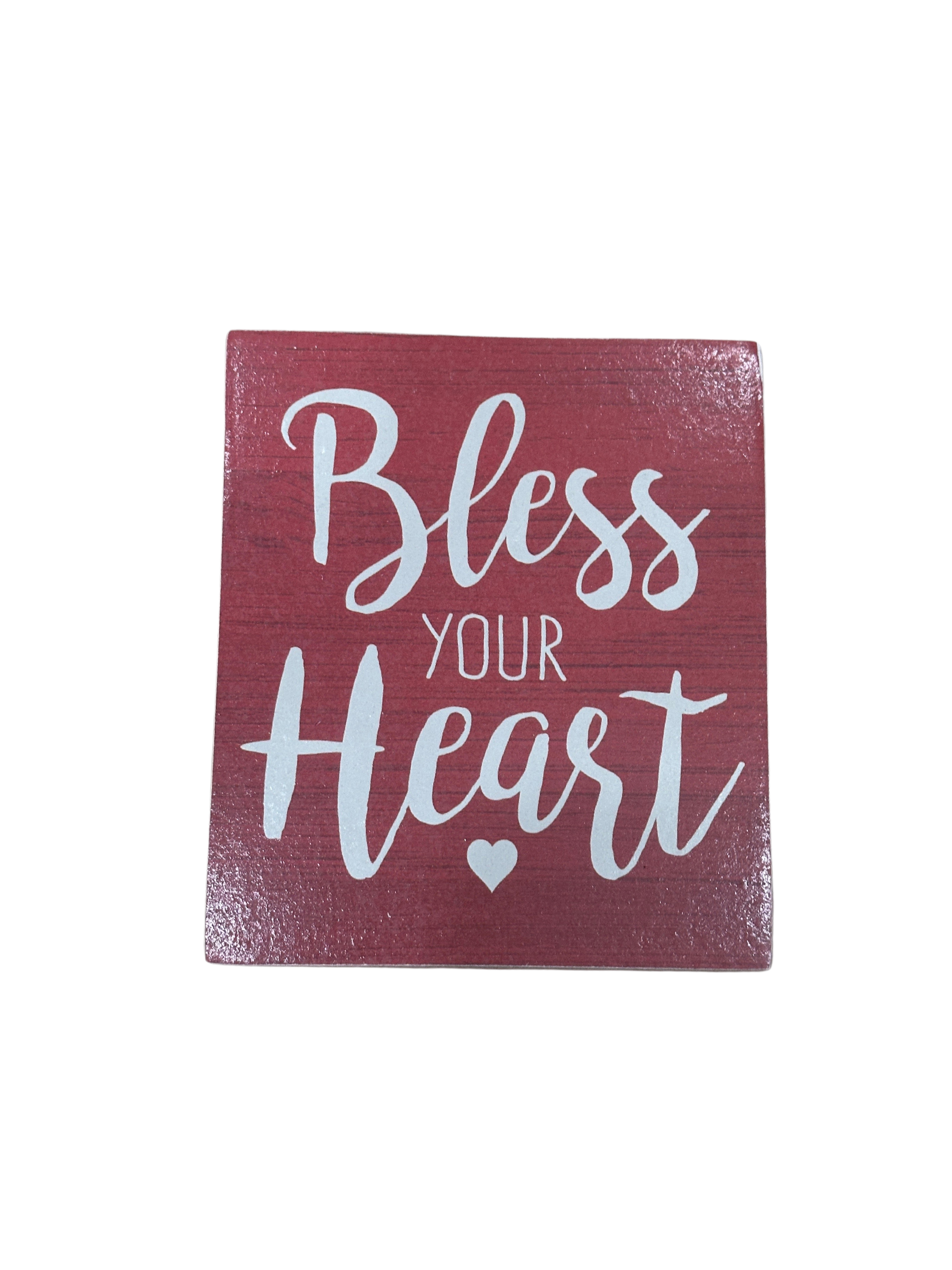 "Bless your heart" with this quirky and playful sign. Perfect for adding a touch of humor to any room, this sign is sure to bring a smile to your face. Show some Southern charm and bless your heart with this unique addition to your decor.