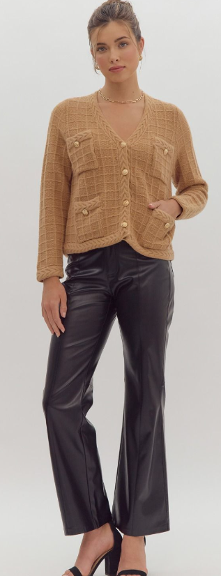 Textured long sleeve button up cropped knit cardigan featuring pockets at front. Unlined. Knit. Non-sheer. Lightweight