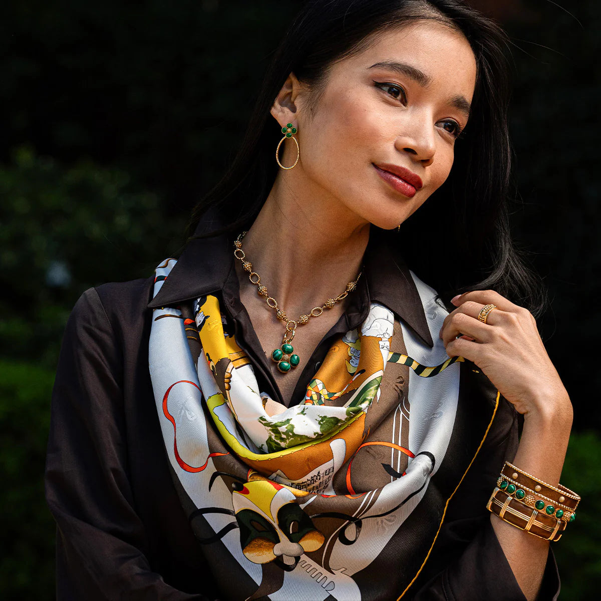 Teardrop hoops of shimmering hammered gold dangle from clover-shaped studs of gorgeous green malachite stones. With understated elegance, this irresistible pair of earrings knows precisely how to make a subtle statement, whether it’s a day at the office or a night out on the town. Lucky you!