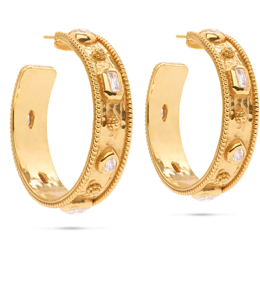 Clean and classic statement hoops wrought in shimmering hammered gold and finished with our iconic berry and thread motif are accented with crystal clear embellishments to sparkle and shine alongside your own inner light.