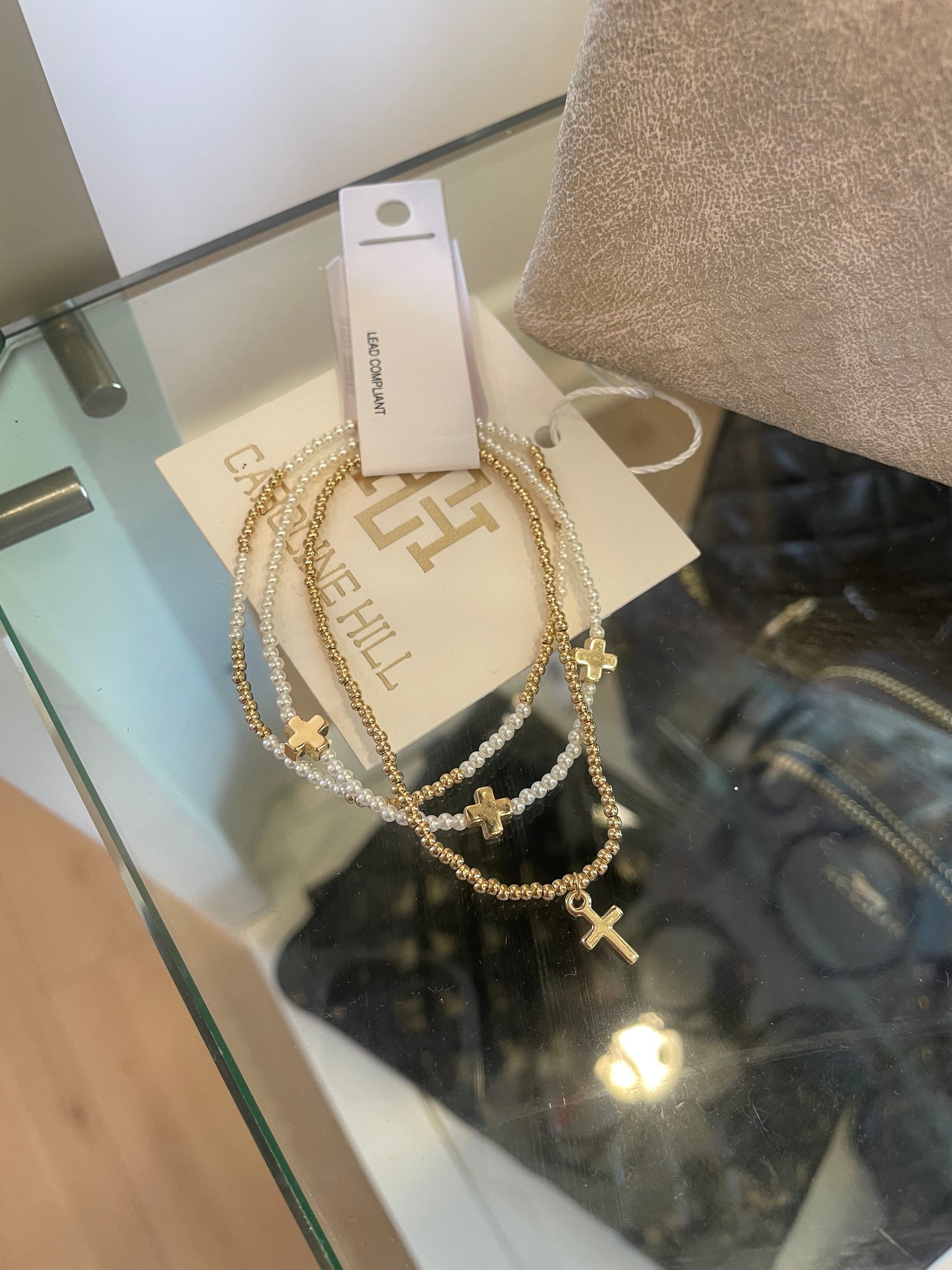 Caroline Hill Chancy Cross and Pearl Stretch Bracelet