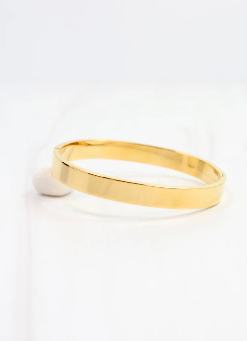 This metal bracelet has a shiny finish and a side clasp closure. It has a simple design that makes it great to wear with any outfit.