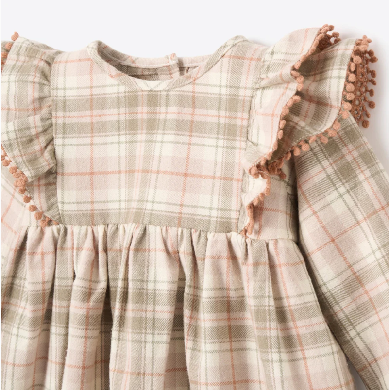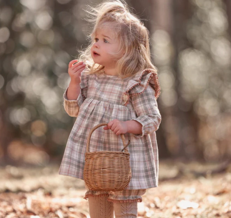 Embrace the beauty of autumn with this plaid flannel dress, featuring charming ruffle shoulders in warm hues of green, cream, and rust. Perfect for fall strolls among the leaves or Thanksgiving gatherings, this cozy dress captures the essence of the season in timeless style.