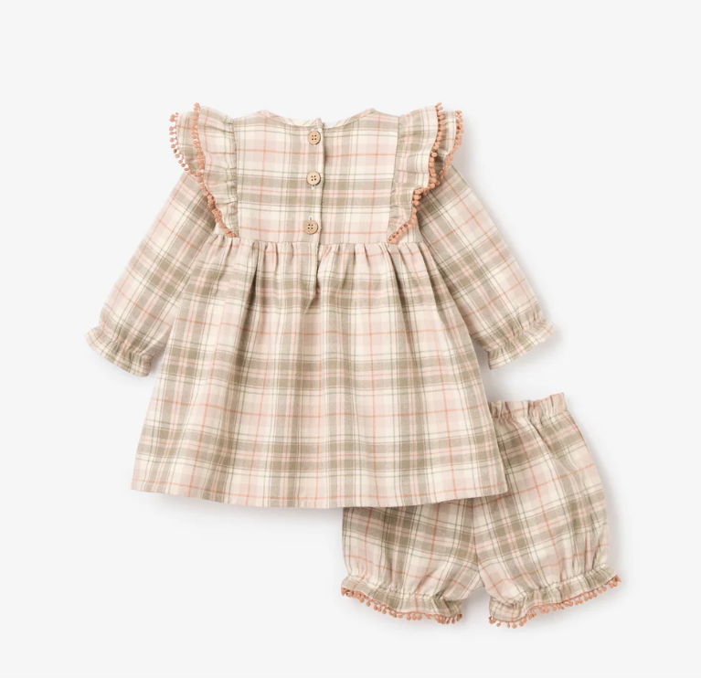 Elegant Baby Plaid Ruffle Shoulder Dress & Bloomer Set