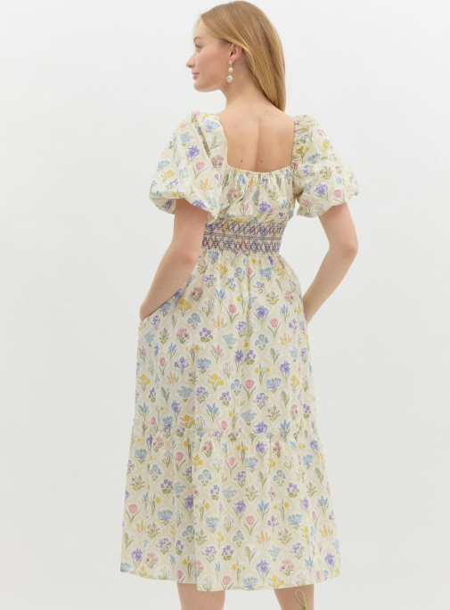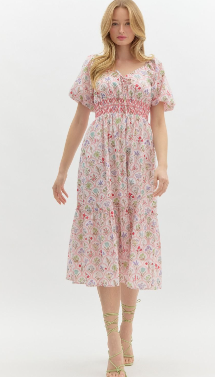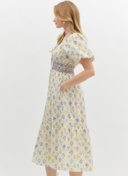 Floral print adjustable v-neck tie elasticated shoulder short bubble sleeve pullover midi dress featuring smocked embroidered elasticized empire. Pockets at side. Lined. Woven. Non-sheer. Lightweight.