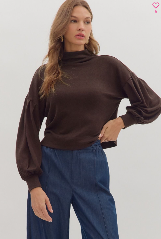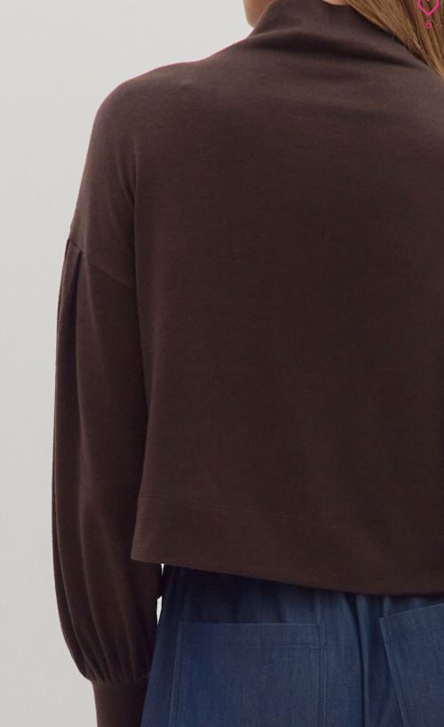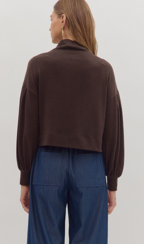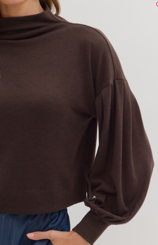 Solid long sleeve mock neck knit top featuring drop shoulder and pleated balloon sleeves with wide cuffs. Unlined. Knit. Non-sheer. Medium weight.