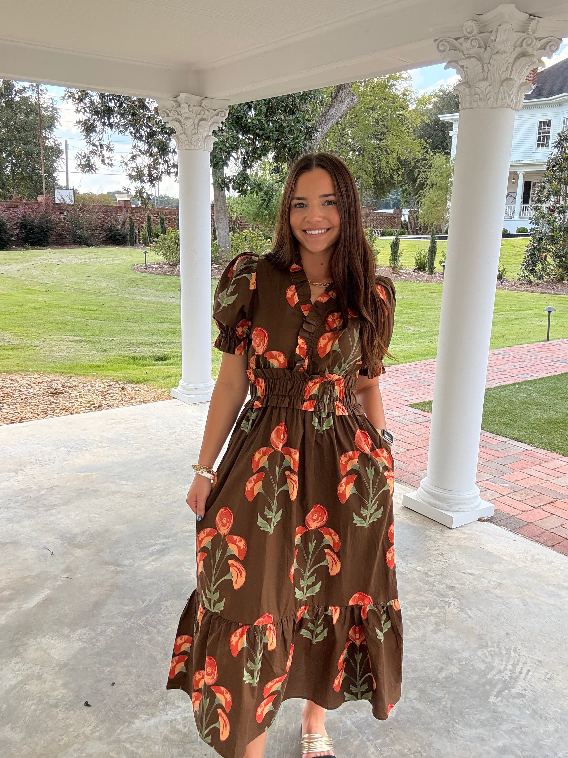Floral print short puff sleeve midi dress featuring ruffle accent V-neck with hidden button closure. Elasticated empire waist. Pockets at sides. Lined. Woven. Non-sheer. Lightweight.