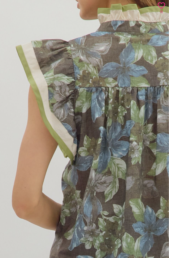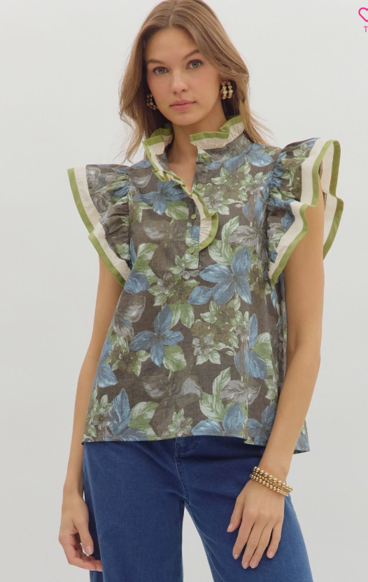 Floral print multicolor contrast accent ruffle detail flutter sleeve top. Ruffle band collar button closure at front. Unlined. Woven. Non-sheer. Lightweight.