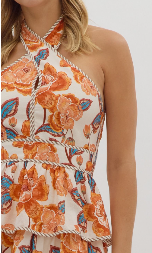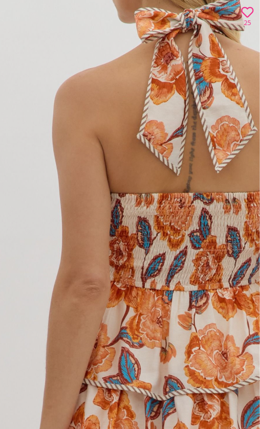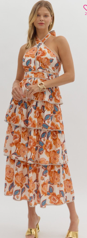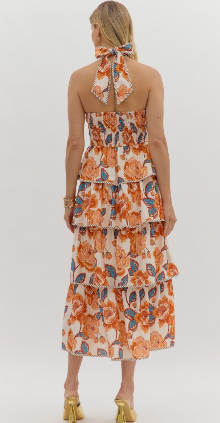 Floral print tiered bow tie halter midi dress featuriung contrast accented binding finish. Smocking closure at back. Lined. Woven. Non-sheer. Lightweight.
