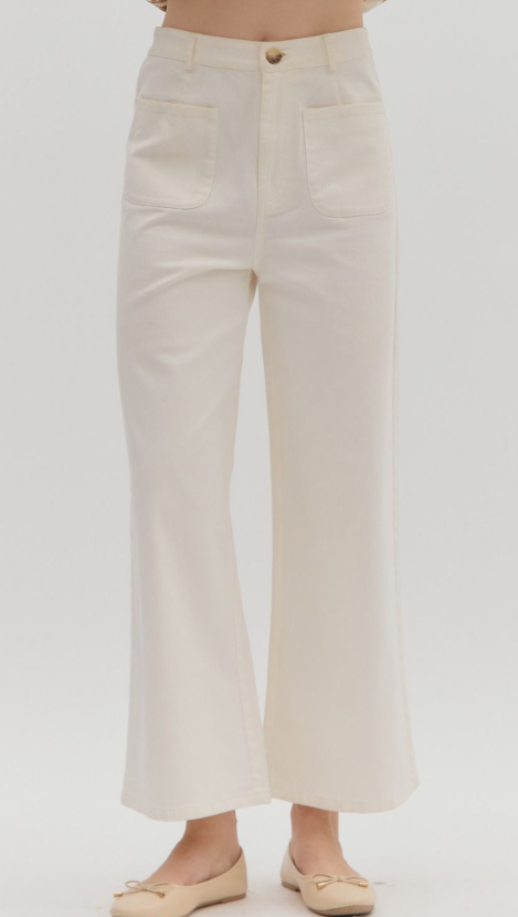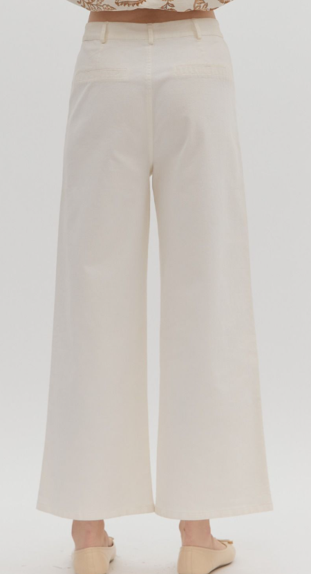 Solid high waisted wide leg ankle length pants featuring patch pockets at front. Faux pocket at back. Belt loops. Button and zipper closure at front. Unlined. Woven. Non-sheer. Lightweight.