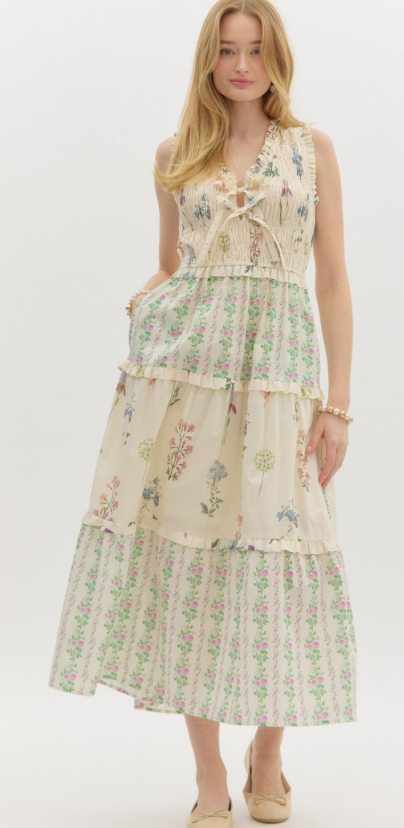 Multi-floral print ruffle accented tiered sleeveless midi dress featuring smocked top. V-neck bow tie closure at front. Pockets at side. Lined. Woven. Non-sheer. Lightweight.