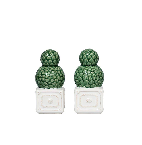 Instantly evocative of formal gardens found at resplendent European castles and estates, this hand-painted topiary set of salt and pepper shakers is a must-have addition to any spring or summer table setting. Equally chic and whimsical, you may want to keep them on the countertop in perpetuity (and they make a fabulous gift)!