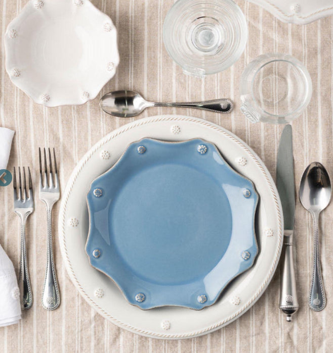 From our Berry & Thread Collection - Rimmed with a simple thread and adorned with a sprinkling of berries, this iconic dinnerware collection embraces historic motifs in a sublime blue hue. Mix and match this sweetly scalloped dessert/salad plate with so many of our collections.