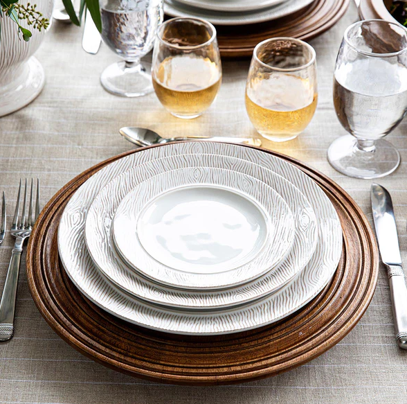 Inspired by the oldest grove of oak trees in England’s Blenheim Park, this woodgrain textured collection is rendered in a fresh and peaceful palette of creams and warm browns, with our signature whitewash glaze and a patina to highlight the beautifully rich motif. Equally idyllic and chic, this versatile plate makes an eye-catching layering piece with other patterns and collections, and serves up side dishes, canapés, and nibbles with easy style and grace.