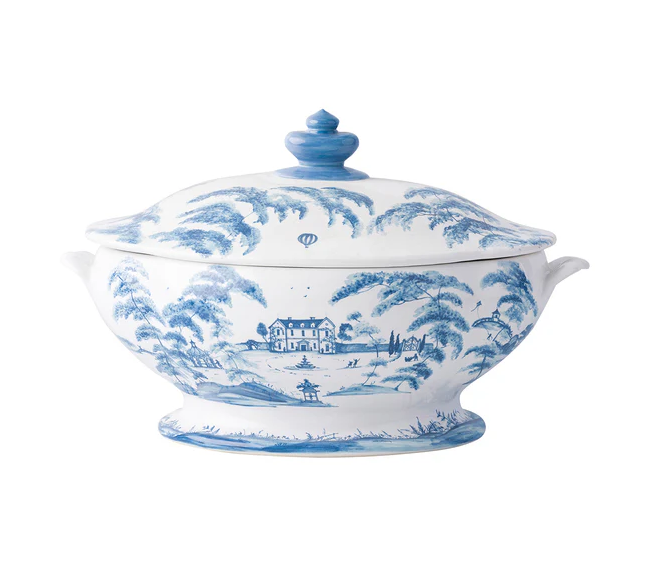 From our Country Estate Collection - As an unforgettable wedding gift or a showstopper for your own table, this covered tureen is as picturesque as it is oven-to-table practical. Sweeping vistas of the Main House adorn the exterior, while a scene of the Garden Conservatory graces the interior basin - making this intricately detailed vessel feel like an heirloom piece.