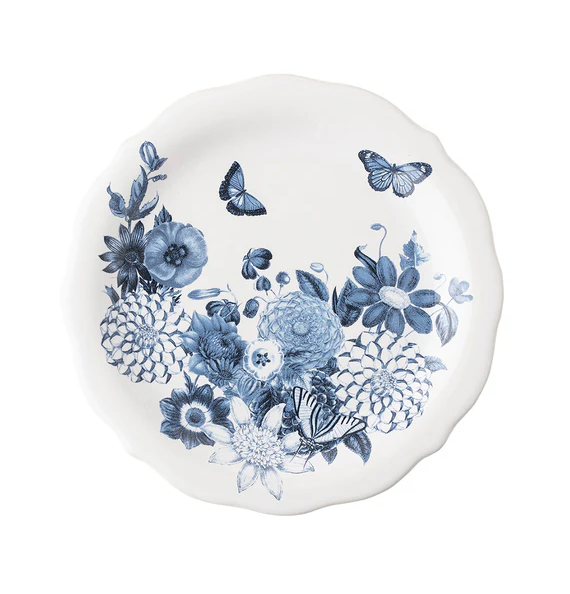 The wildly romantic motif of blooms and butterflies in a dreamy palette of chambray blue hues makes this pretty plate ideal for serving salads (here is a perfect moment to sprinkle flower petals on your greens) and desserts (we adore the contrast of anything with bright summer berries). The softly scalloped rim creates an eye-catching silhouette that is lovely for layering with other tableware.