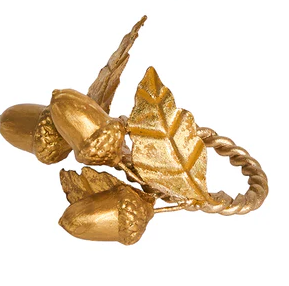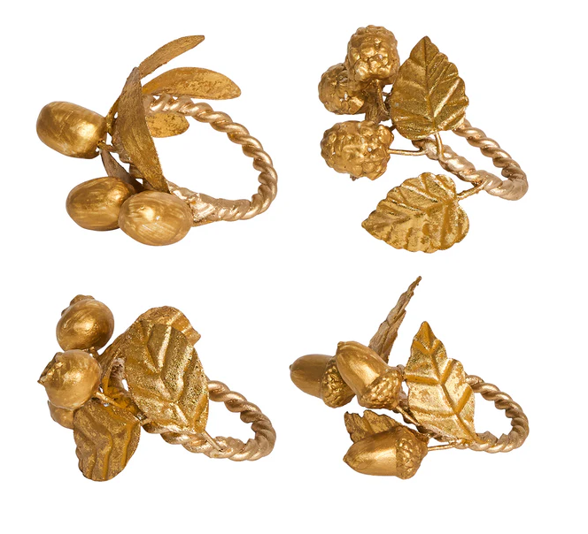 An ode to the quiet splendor of the autumn woods, this set of 4 napkin rings in lustrous gold are elegant and whimsical. Each piece depicts a different kind of leaf cluster in intricate detail. Gift boxed.
