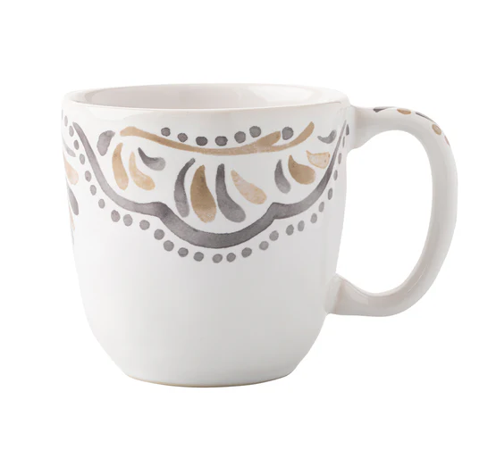A journey to the sandy Iberian coast inspired this motif of hand-painted tiles reinterpreted in a neutral colorway onto key accent pieces, such as this fabulously versatile mug (perfect for coffee & tea) cup!