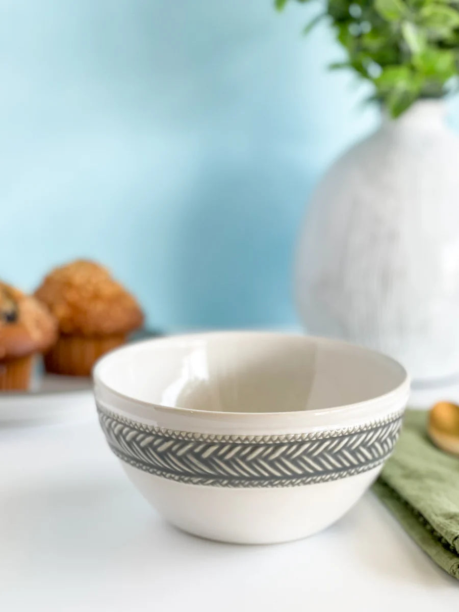 From our Le Panier Collection - Inspired by the French basket weave often found in equestrian and nautical traditions, this bowl is rimmed with a beautifully hand-painted Delft Blue or grey mist herringbone band.
