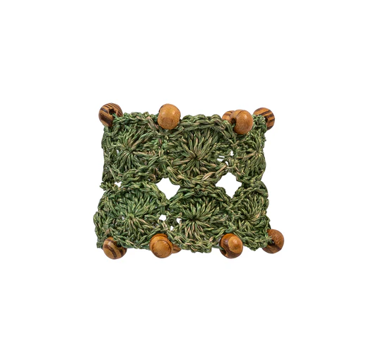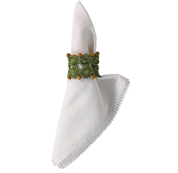 These hand-crafted napkin rings are made of intricately woven Abaca fibers in green and embellished with wooden beads for a look that is naturally textural, casual, and a bit bohe