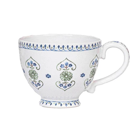 A fresh take on Seville's romantic, folkloric florals, this generous breakfast cup is designed for coffee, tea, and anything else delicious and soothing. We especially adore the sculptural handle, tiny foot and intricate trim adorning the top and bottom.
