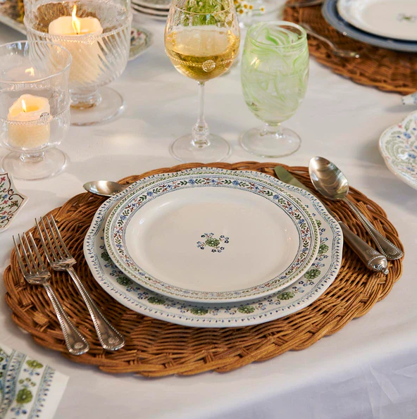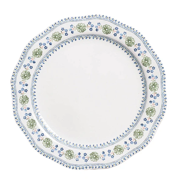 With our heads in the clouds and our feet on the cobblestone streets of ancient Seville, we dreamt up this intricate floral motif that reimagines the romantic city's hand-painted tiles and patterns, rendered in the organic colors of the Spanish countryside. Equal parts fresh, tranquil, and whimsical, the scalloped rim of this dinner plate is perfect for framing culinary creations and adding a lovely layer to place settings for mixing and matching.