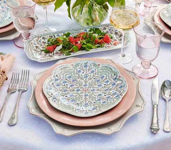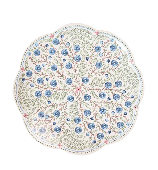 Festooned with a burst of intricate leaves, charming blue flowers and a scalloped rim with tiny dots and pink blossoms, this enchanting plate makes serving up salads and sweets a delicious work of art.