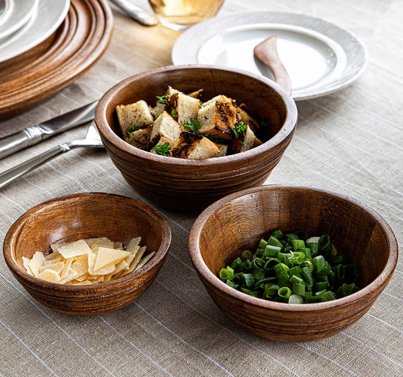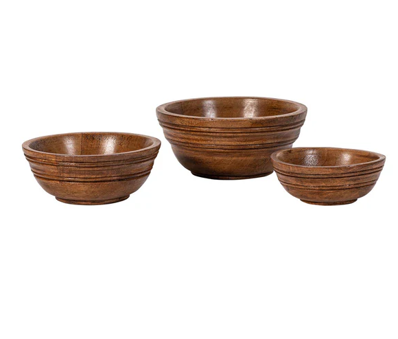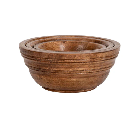 Space-efficient nesting bowls done in naturally beautiful, hand-turned mango wood to infuse texture, warmth, and easy elegance to any setting. Perfect for sides, snacks, appetizers, and sweets, and especially lovely when paired with our Bilbao Wood spreading knives and spoons to complete the look. Volume: Small 5 oz, Medium 12 oz, Large 17 oz