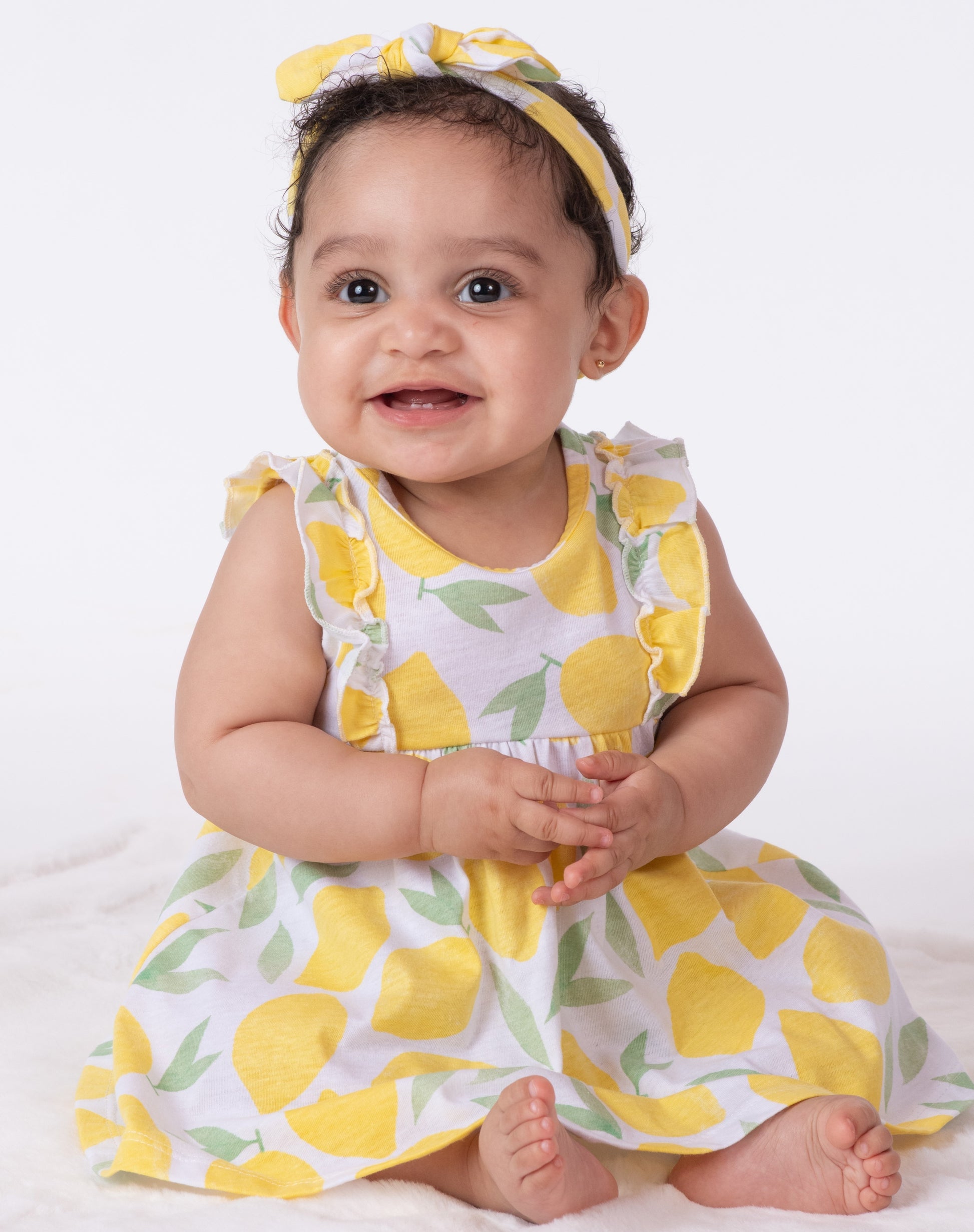 This adorable 3-piece set is 100% jersey knit cotton and contains a sundress with matching bloomers and headband. We are offering this set seven sizes including 3 months, 6 months, 9 months, 12 months, 18 months, and 24 months.