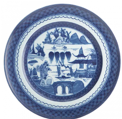 Recognized by the blue lattice border surrounding a variety of landscape scenes, this popular Chinese pattern inspired a number of European versions, most notably English stoneware. The most fashionable tables in the early American Republic were set with blue and white “Canton” or “Nanking” wares, named for the great Chinese trading ports from which they came. Chinese blue and white porcelain was in demand in this country well into the nineteenth century and has become a part of the heritage of many American families. Blue Canton faithfully recaptures this centuries-old tradition and taste.