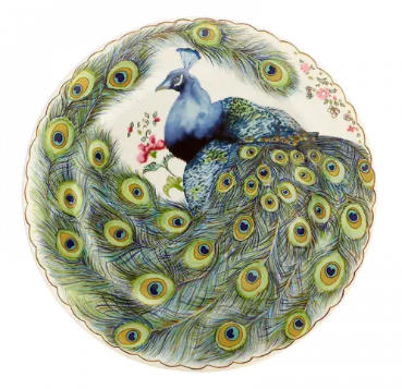 The exotic peacock with its opulent colors, comes alive on this dessert plate.