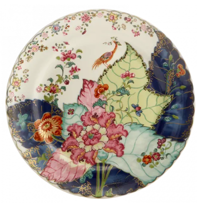 This extravagant design was originally made in China, probably for export to the Portuguese and Brazilian markets. Of all the 18th century dinner patterns, this was the most highly prized. A small phoenix bird perches on the leaves of the flowering Nicotiana (Tobacco) plant. Twenty-seven colors and 22k gold make up this pattern based on an original in the Metropolitan Museum of Art. This pattern, one of the longest running patterns by Mottahedeh, continues its strong popularity today, showing that good design is timeless.