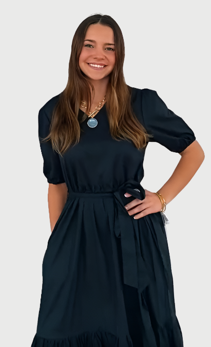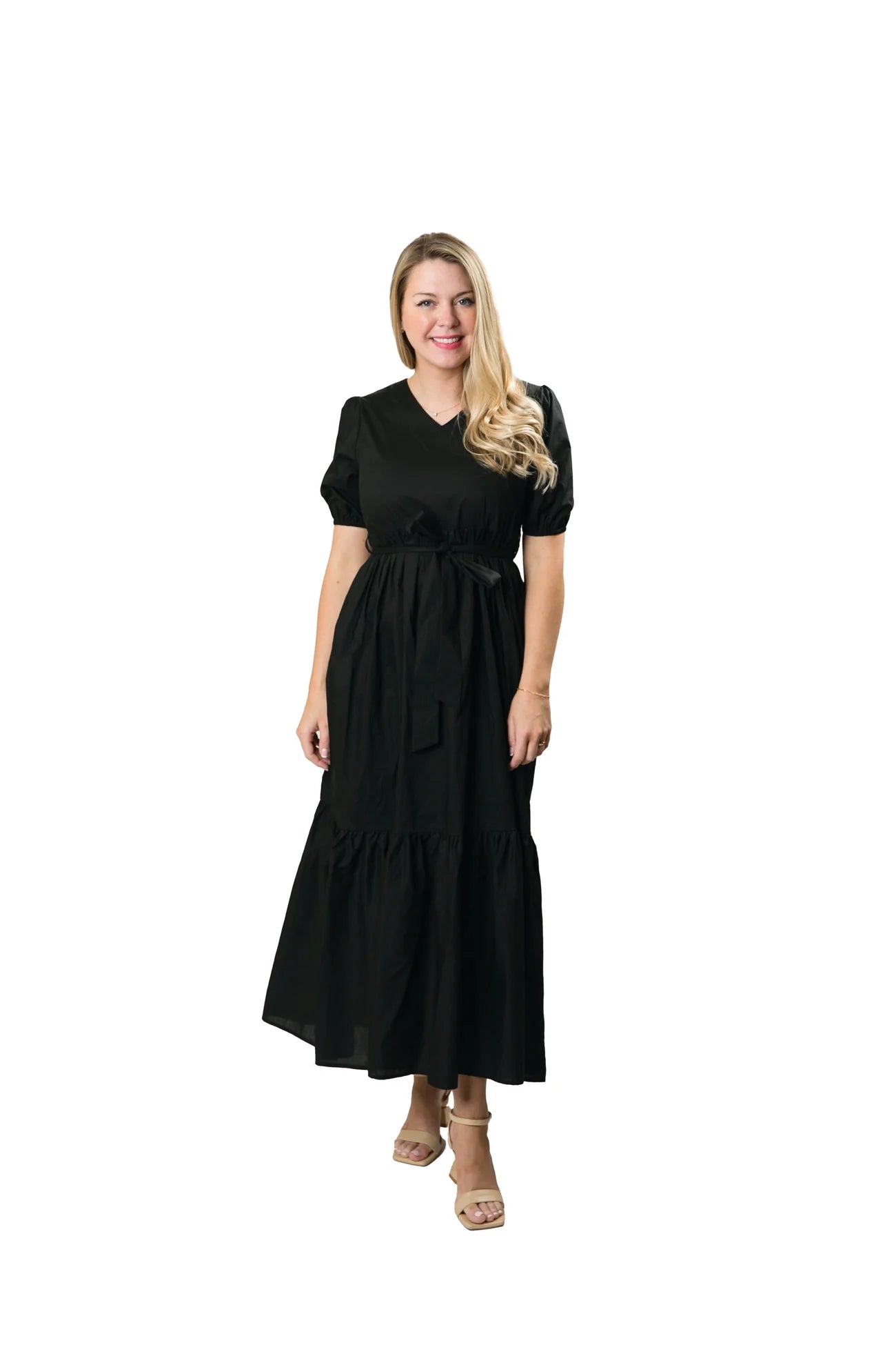 This dress is a timeless blend of chic and classic style. It features an empire waist that flows into a single tier maxi length dress. A tie sash wraps around the waist that makes the sizing easy and comfortable. The puffed short sleeves are elasticized for a comfy fit, while the v-neckline offers an oh-so-flattering look. The back zipper provides an effortless way to slip into and out of your dress. The poplin-like material gives it a fresh, crisp look that's perfect for any occasion. Style this with a Top It Off straw hat and clutch for a wow-worthy look! 100% cotton.