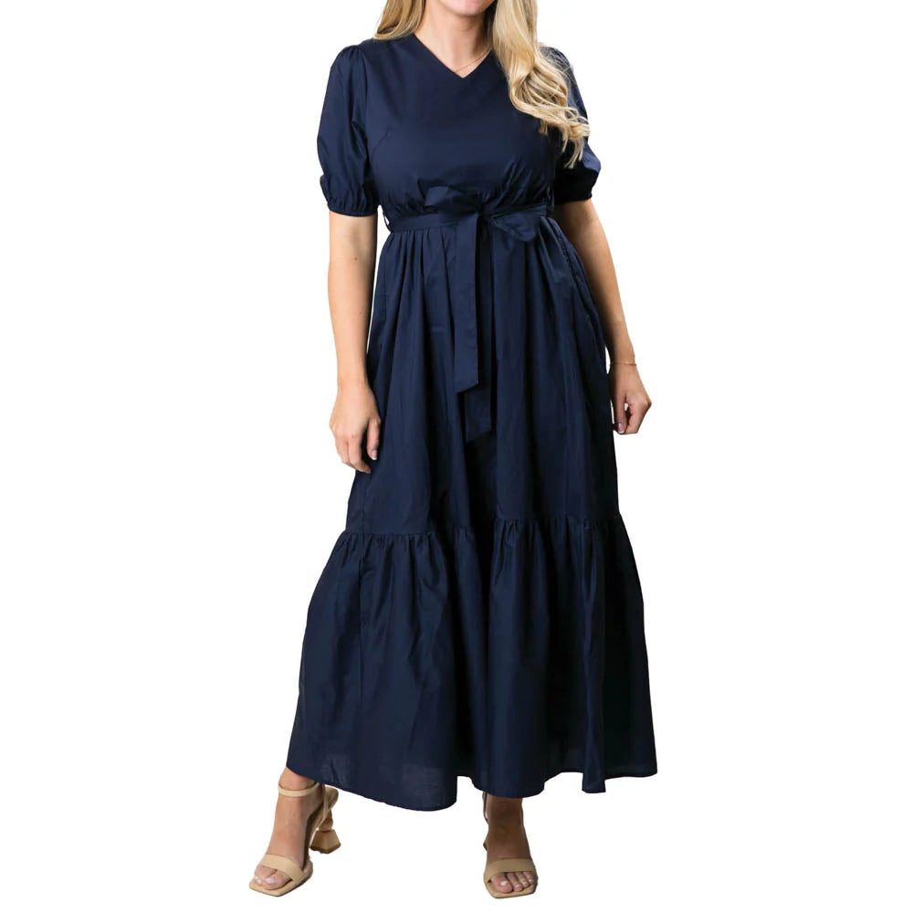 This dress is a timeless blend of chic and classic style. It features an empire waist that flows into a single tier maxi length dress. A tie sash wraps around the waist that makes the sizing easy and comfortable. The puffed short sleeves are elasticized for a comfy fit, while the v-neckline offers an oh-so-flattering look. The back zipper provides an effortless way to slip into and out of your dress. The poplin-like material gives it a fresh, crisp look that's perfect for any occasion. Style this with a Top It Off clutch for a wow-worthy look! 100% cotton.