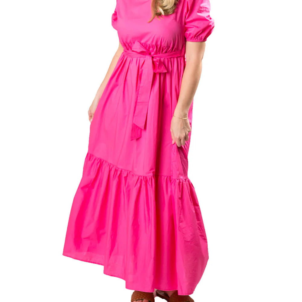 This dress is a timeless blend of chic and classic style. It features an empire waist that flows into a single tier maxi length dress. A tie sash wraps around the waist that makes the sizing easy and comfortable. The puffed short sleeves are elasticized for a comfy fit, while the v-neckline offers an oh-so-flattering look. The back zipper provides an effortless way to slip into and out of your dress. The poplin-like material gives it a fresh, crisp look that's perfect for any occasion. Style this with a Top It Off straw hat and clutch for a wow-worthy look! 100% cotton.