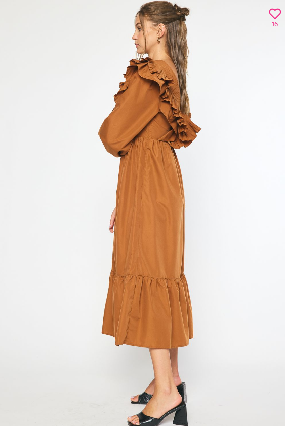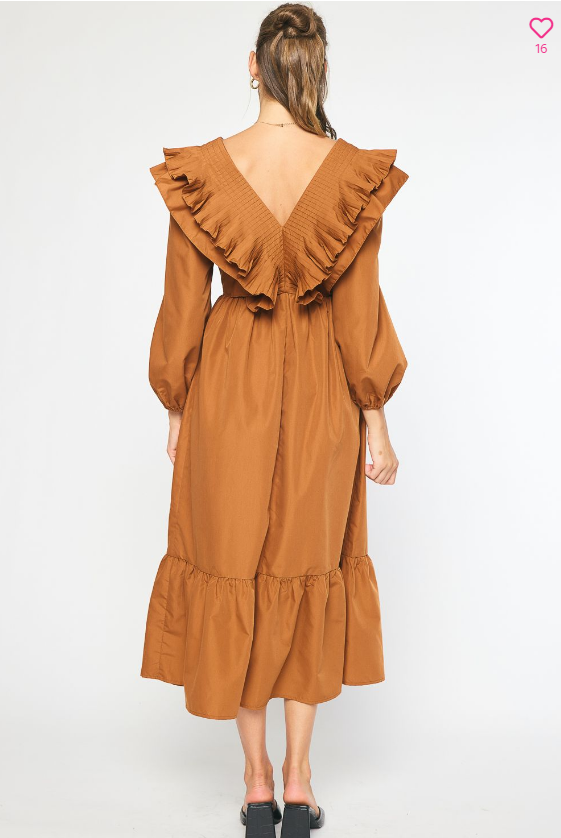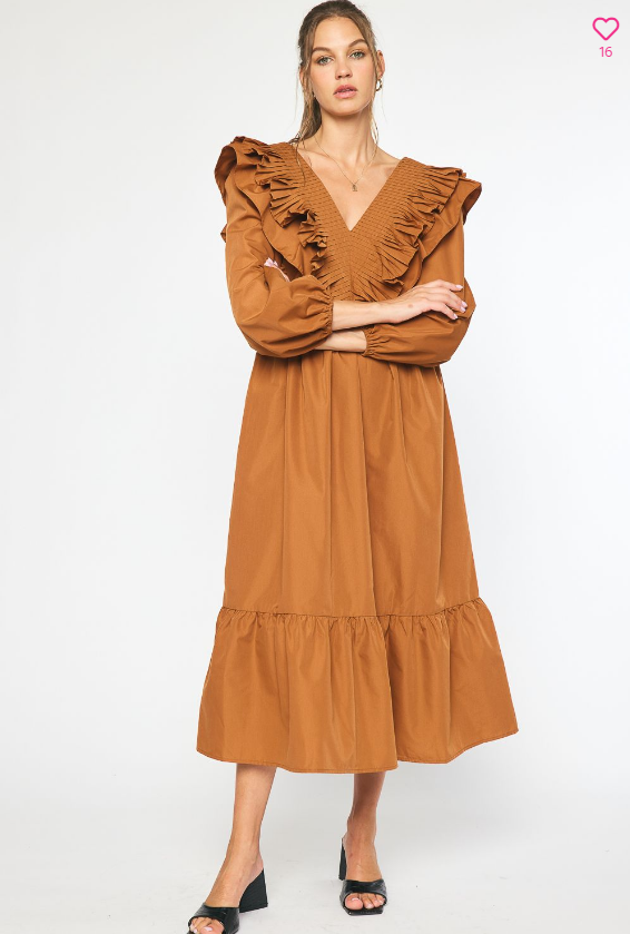 Solid v-neck long sleeve maxi dress featuring pleats ruffle detail at top. Lined. Woven. Non-sheer. Lightweight.